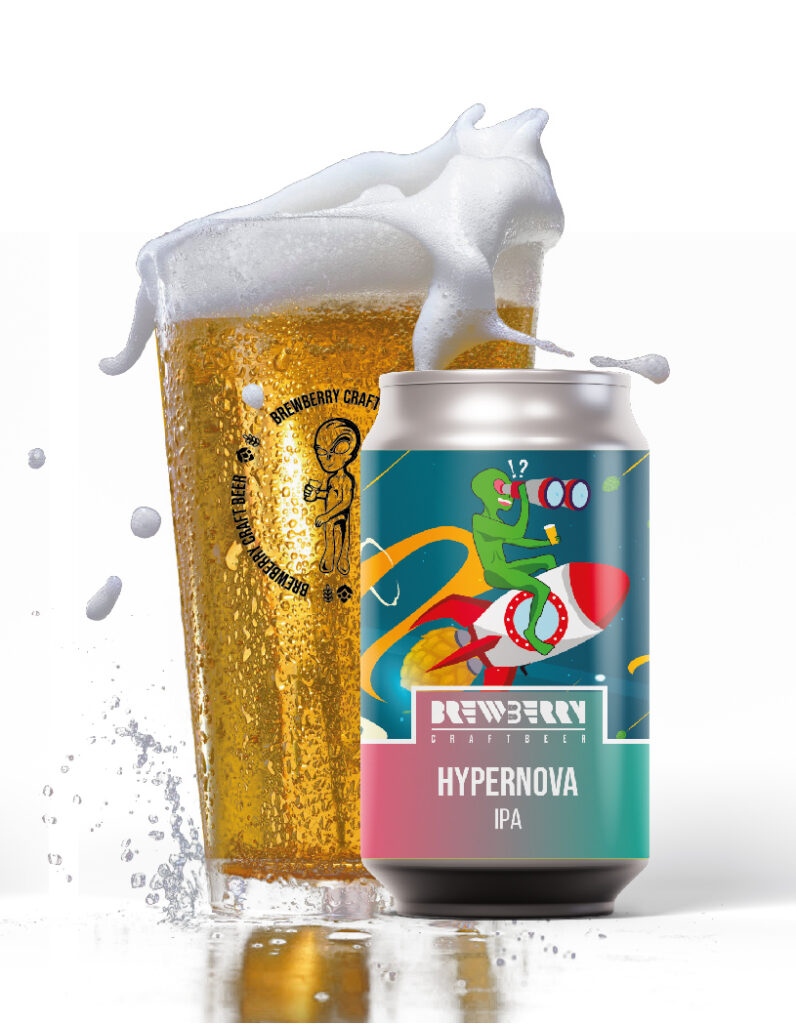 La particolarità delle grafiche delle nostre IPA è la presenza ricorrente di un alieno: in questa birra è raffigurato mente va alla ricerca di una nuova galassia, la Hypernova.